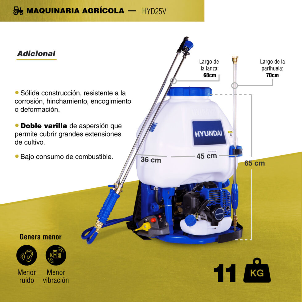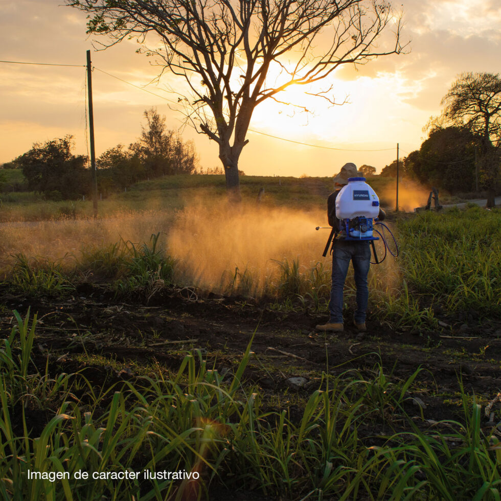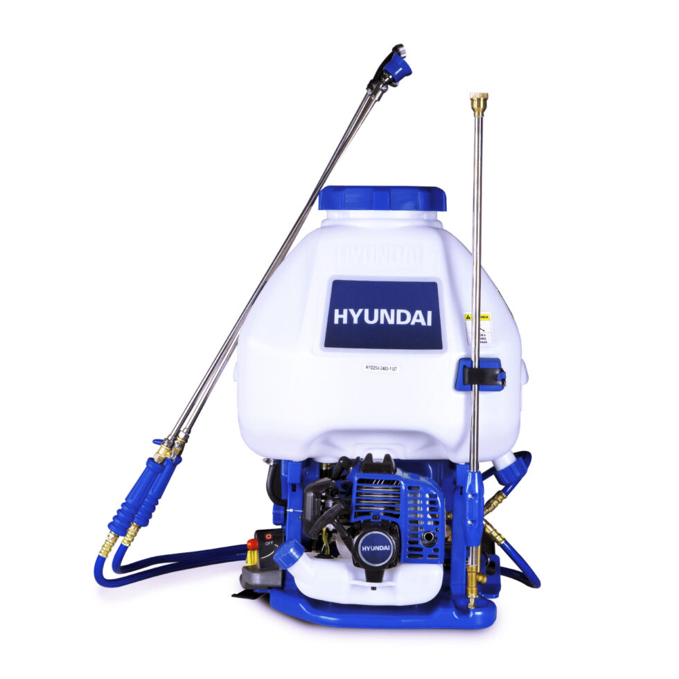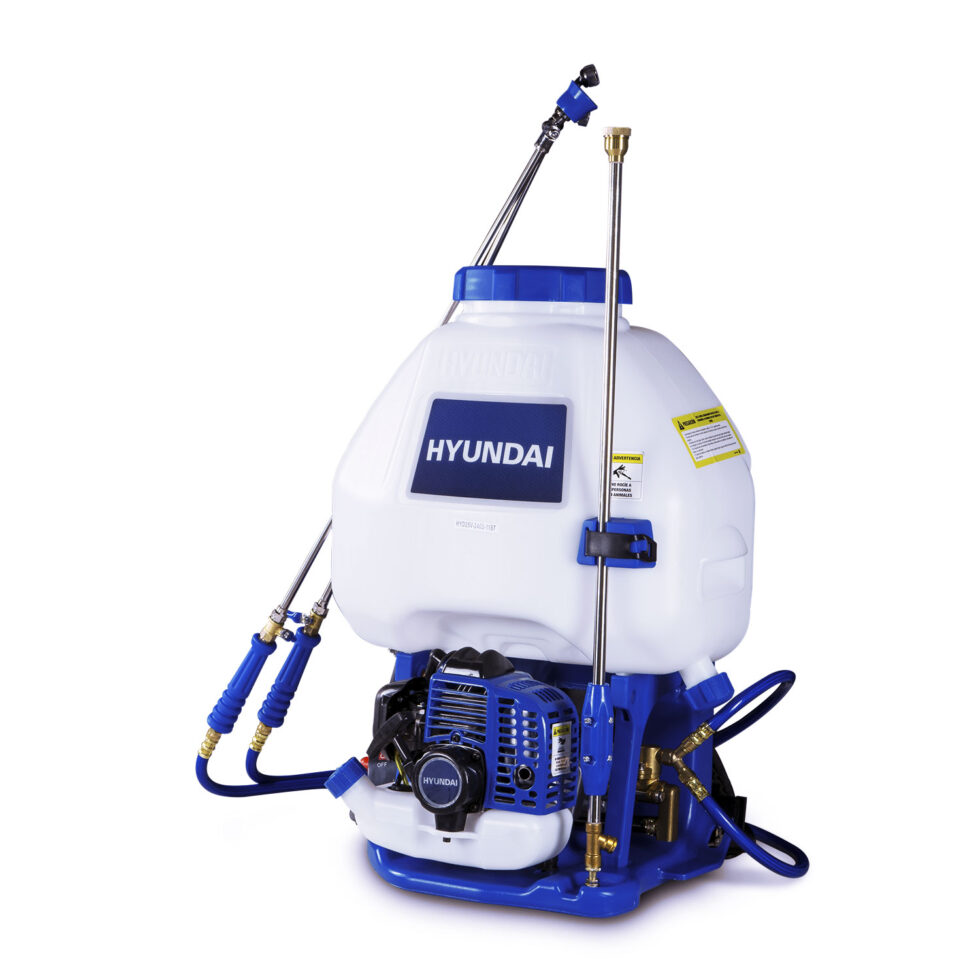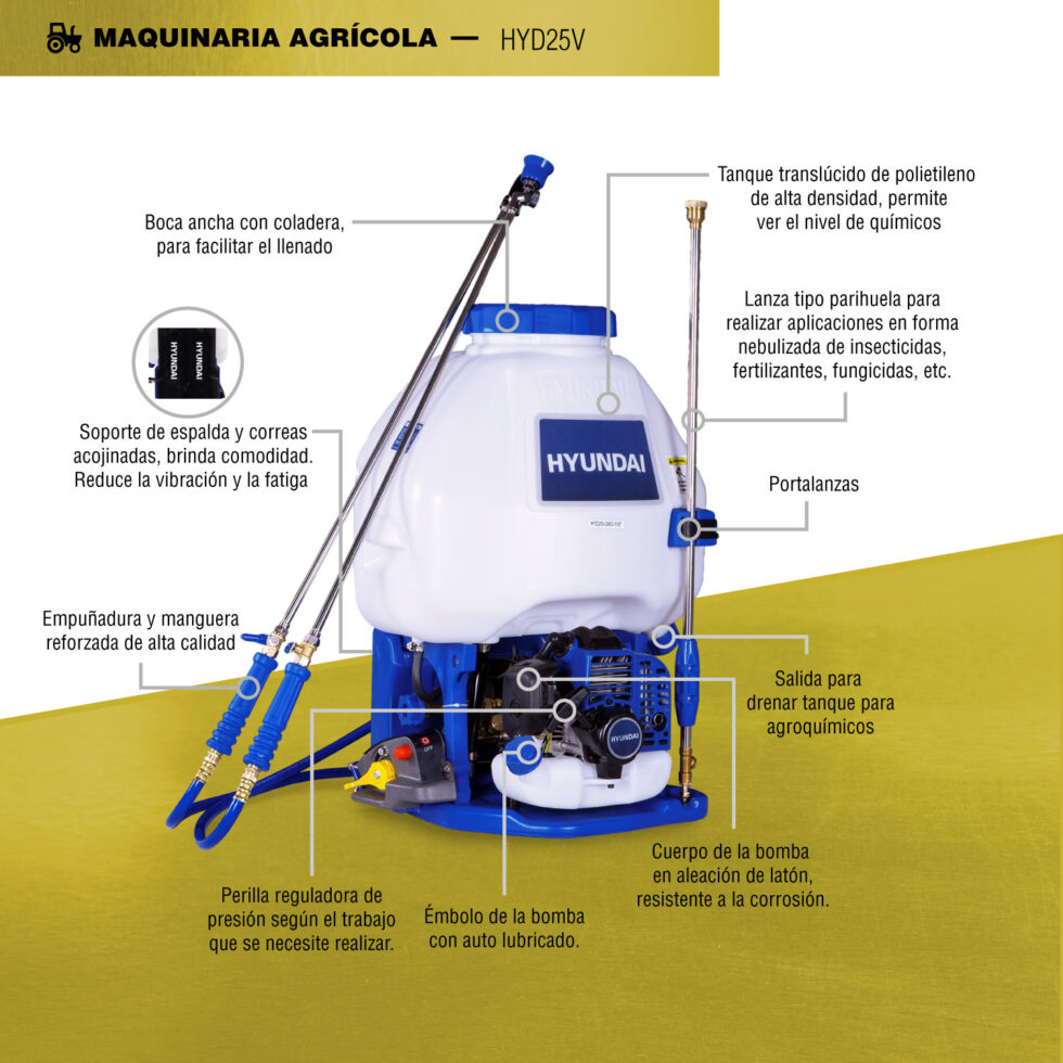 Fumigadora Profesional para uso agrícola con capacidad de 25 litros y motor de 2 tiempos para manejo de líquidos marca HYUNDAI.