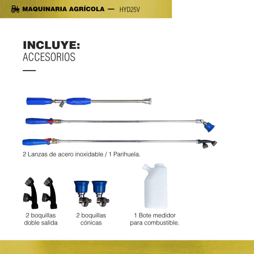 Incluye 4 boquillas, doble varilla y lanza para parihuela.